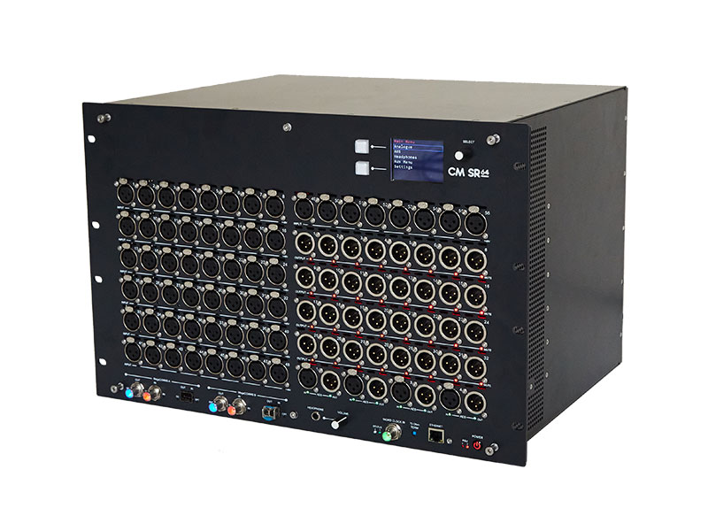 CM-SR64是一款有7U高度配备56个模拟输入和32个模拟输出及8个AES3输入和8个AES3输出的舞台盒。2.4英寸彩色LCD可显示全面菜单结构,并可设置本地调整输入电平、麦克风增益和幻象电源。集成的耳机放大器增强了可用性、节省了时间,可以直接在舞台机架上监测音频。