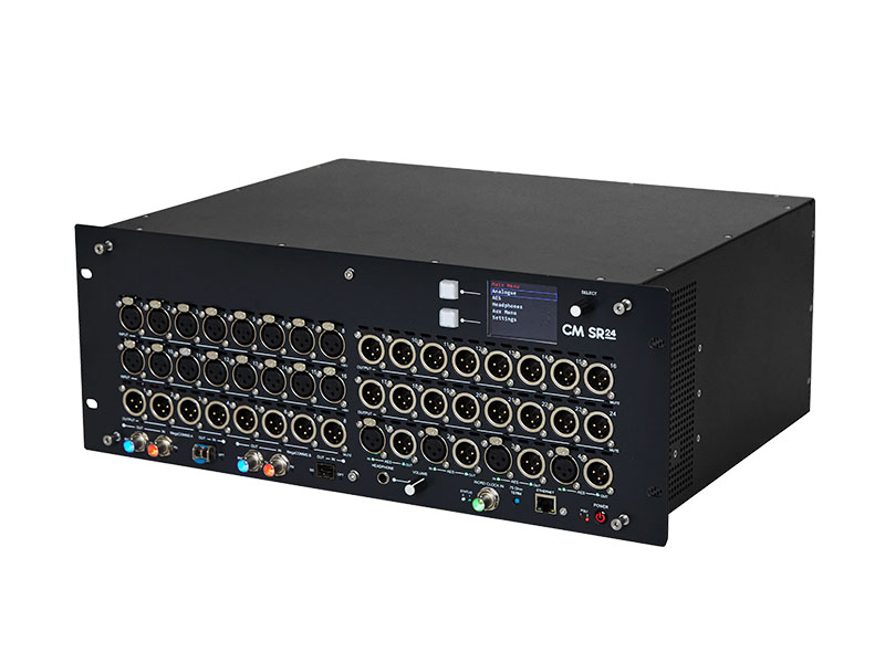 CM-SR24是一款有两个4U高度配备16个模拟输入和24个模拟输出及8个AES3输入和8个AES3输出的舞台盒。2.4英寸彩色LCD可显示全面菜单结构,并可设置本地调整输入电平、麦克风增益和幻象电源。集成的耳机放大器增强了可用性、节省了时间,可以直接在舞台机架上监测音频。