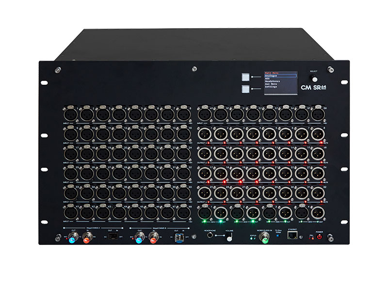 CM-SR64是一款有7U高度配备56个模拟输入和32个模拟输出及8个AES3输入和8个AES3输出的舞台盒。2.4英寸彩色LCD可显示全面菜单结构,并可设置本地调整输入电平、麦克风增益和幻象电源。集成的耳机放大器增强了可用性、节省了时间,可以直接在舞台机架上监测音频。